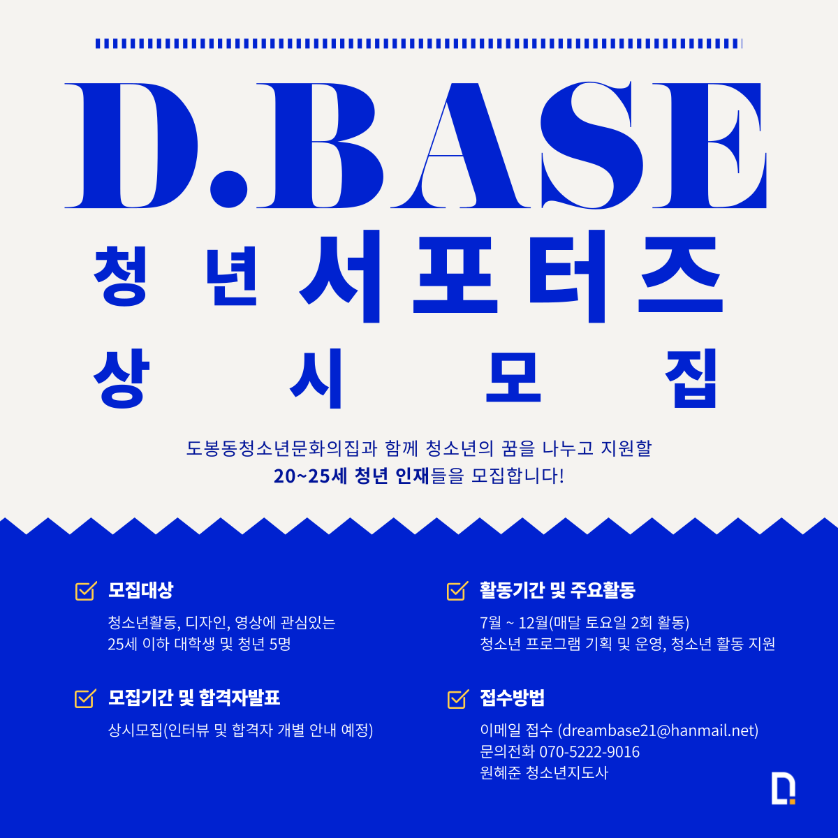 - 양식 다운로드 및 작성 후, 이메일 접수(dreambase21@hanmail.net)
