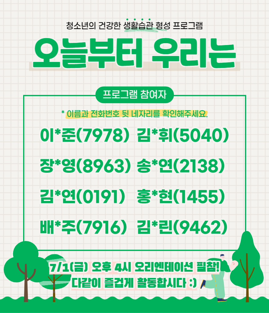 7/1(금) 오후 4시 오리엔테이션에 꼭 참석해주시기 바랍니다.