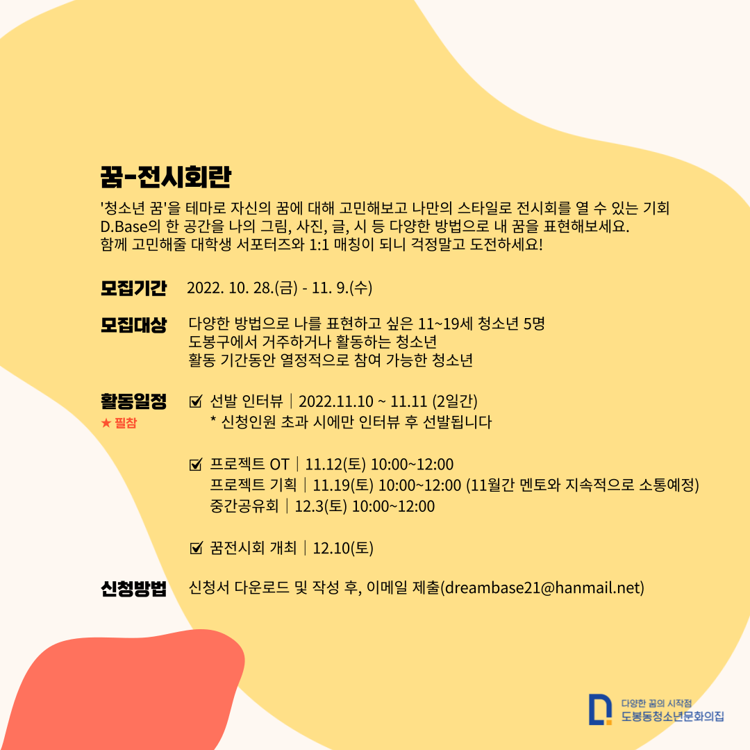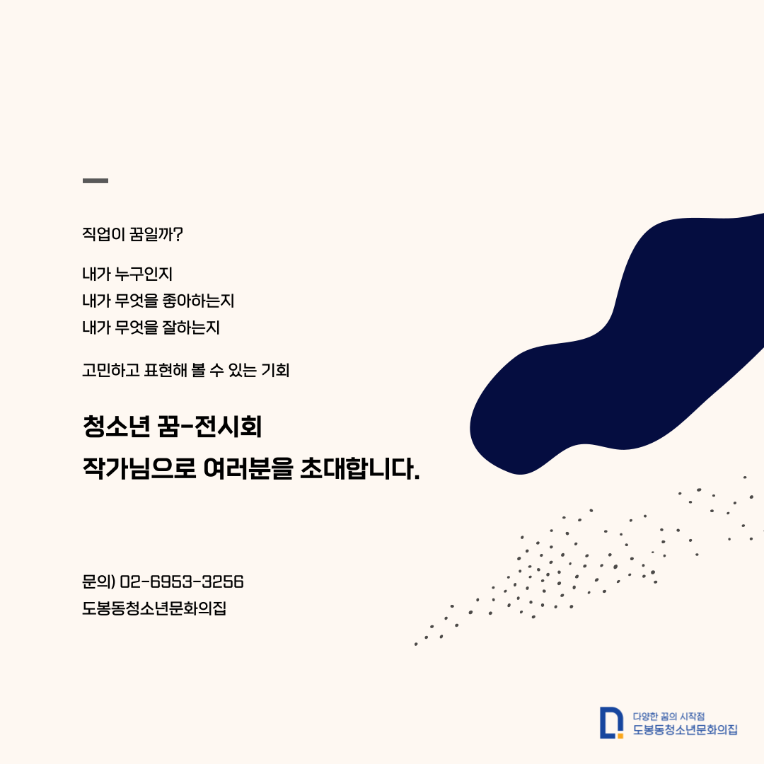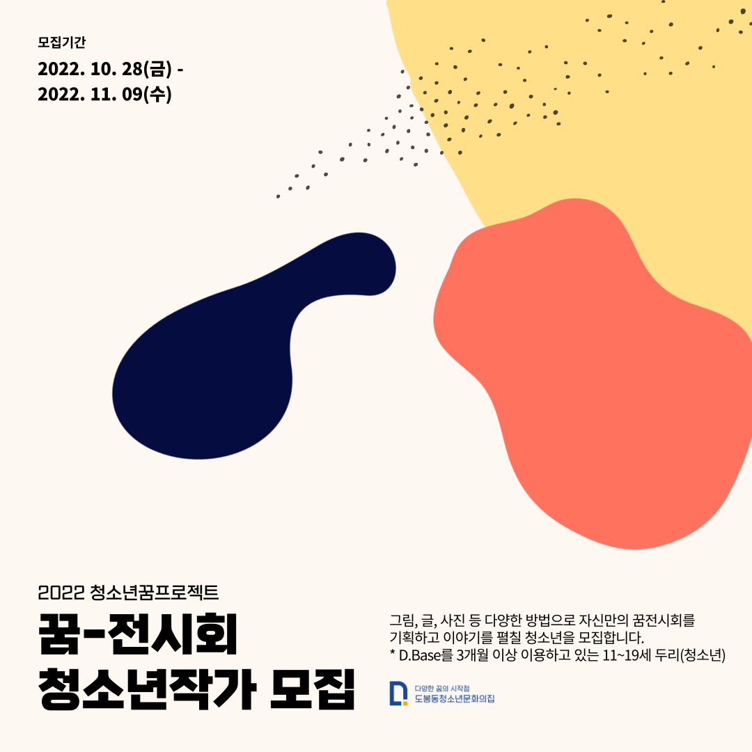 그림, 글, 사진, 시 등 다양한 방법으로 자신만의 꿈 전시회를 펼칠 청소년을 모집합니다.