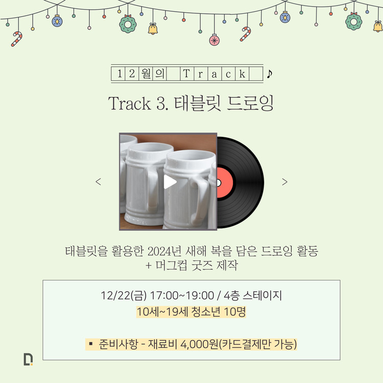 - 내용: 태블릿을 활용한 2024년 새해 복을 담은 드로잉 체험활동(+머그컵 굿즈 제작 예정)